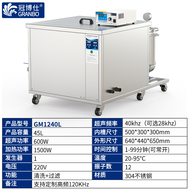 - GM系列臺式超聲波清洗機建議使用水溶性清洗劑,嚴禁使用強酸性或易燃性清洗劑。如需使用溶劑型清洗劑切勿加溫,并且工作約80分鐘后務必歌息一段時間后再啟動工作。