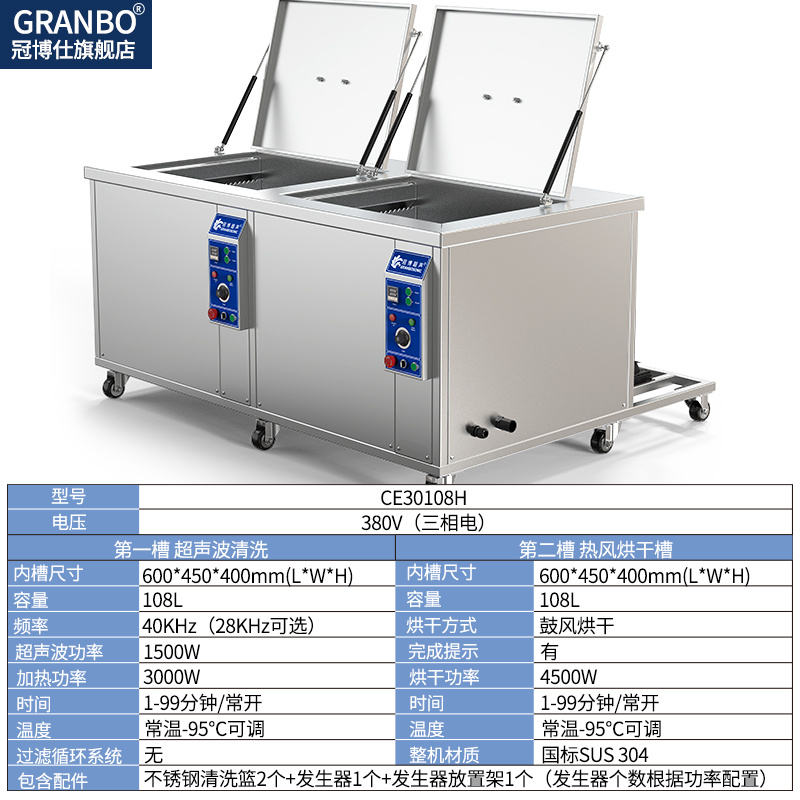 冠博仕GE30108H雙槽超聲波清洗機帶鼓風烘干 | 108L/1500W | 適用于船舶和航空航天行業的重型脫脂作業